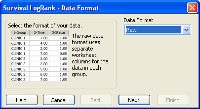 SigmaStat グループにある Tests ドロップダウンリストから次を選択します:Survival→Kaplan-Meier→LogRank検定ウィザードの Survival LogRant – Data Format パネルが表示されます。