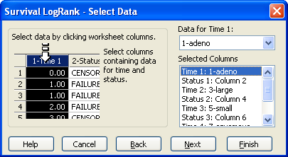 Selected Columns リストに別のワークシート列を割り当てたい場合には、ワークシートで直接その列を選択するか、Data for Data ドロップダウンリストからその列を選択します。Selected Columns リストの一行目 (Time 1) に割り当てられるのは最初に選択した列で、次に選択した列がリストの次の行 (Status 1) に割り当てられます。各行には、選択した列のタイトルが表示されます。分析したい全ての群について Time, Status 列の選択を続けます。