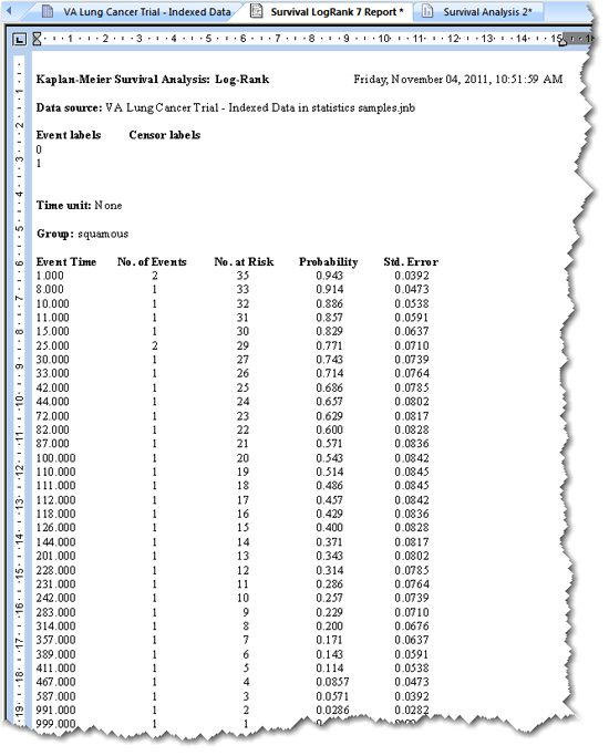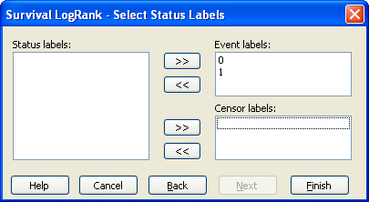 Finish をクリックすると、生存グラフとレポートが作成されます。得られる結果は選択した検定オプションの内容によって変わります。データフォーマットに Indexed を選択している場合、検定ウィザードの Select Data パネルには、Group, Time, Status の3列をワークシートから選択するよう指示されます。