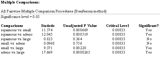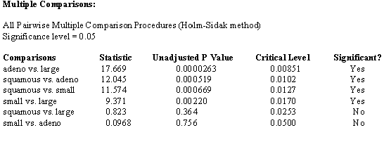 多重比較を P 値が有意なときだけ実行するよう選択しており、LogRank プロシージャーで出力される P 値が設定した P 値と等しいかそれより小さい場合、あるいは、Options for LogRank ダイアログで多重比較を常に実行するよう選択している場合は、多重比較の結果がレポートに表示されます。