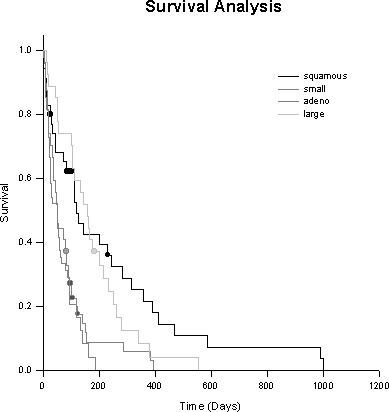 Standard Error Bars:これを選択すると、生存確率に関する標準誤差のエラーバーが追加されます。エラーバーは、故障 (failure) の発生時点に配置されます。これらの要素は、いずれも生存曲線と同じカラーでグラフに配置されます。グラフを作成した後は、Graph Properties を使って、これらのカラー、および、その他のグラフ属性を変更できます。