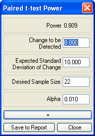 Change to be Detected ボックスに入力するのは、処理前と処理後の変化の大きさです。この変化の大きさは、2群の平均値の差によって決定します。期待する処理効果の大きさは、過去の実験から決定することも、単なる推定量とすることもできます。