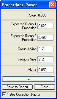 - SigmaStat グループから以下を選択します:Power→ProportionsProportions Power ダイアログボックスが表示されます。