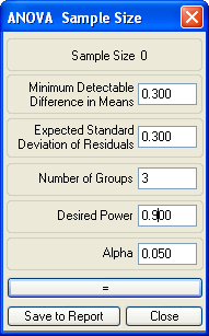 - Save to Report をクリックすると、サンプルサイズの計算の設定内容とそれによって得られた結果が現在のレポートに保存されます。Close をクリックしてダイアログを閉じます。