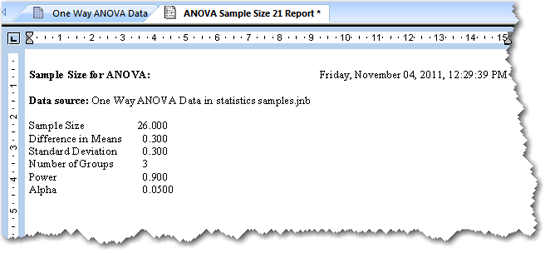 レポートに表示された一元配置分散分析のサンプルサイズの結果