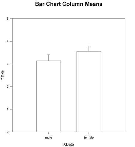 グラフデータがインデックス付きである場合、因子列の各水準が棒グラフの棒の目盛りに、列タイトルが X および Y 軸のタイトルに使用されます。グラフデータが生データまたは統計フォーマットである場合、列タイトルが棒グラフの棒の目盛りに使用され、グラフの軸タイトルにはデフォルトの X Data と Y Data が配置されます。
