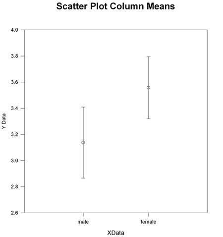グラフデータがインデックス付きである場合、因子列の各水準が散布図の点の目盛りに、列タイトルが X および Y 軸のタイトルに使用されます。グラフデータが生データまたは統計フォーマットである場合、列タイトルが散布図の点の目盛りに使用され、グラフの軸タイトルにはデフォルトの X Data と Y Data が配置されます。