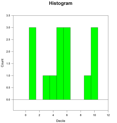 このヒストグラムには、定義された間隔セットを使用して、特定範囲内にある生の残差がプロットされます。残差を分割するヒストグラムの間隔の増分は均一で、それぞれの間隔にある残差の件数がヒストグラムの棒としてプロットされます。X 軸はヒストグラムの間隔を、Y 軸は各群の残差の数をあらわします。