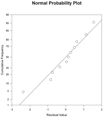 正規確率プロットは、生の残差の度数 (frequency) をプロットするものです。残差はソートされたあと、ガウス分布の領域をあらわす曲線の周囲の点として確率軸上にプロットされます。ガウス曲線に沿って残差がプロットされていれば、そのデータは正規分布母集団から抽出されたことをあらわします。X 軸は残差の値をあらわす線形スケールです。Y 軸は残差の累積度数をあらわす確率スケールです。