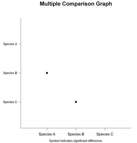 多重比較グラフが利用できるのは、全ての分散分析 (ANOVA) レポートです。このグラフには、ある有意な因子に関する水準間の有意差がプロットされます。指定した多重比較検定によって有意とレポートされた因子毎にグラフが1つ作成されます。例えば、有意な因子が1つあるとレポートされた場合、表示されるグラフは1つ、有意な因子が2つあるとレポートされたら表示されるグラフは2つという具合です。ある因子が有意であるとレポートされなかった場合、その因子のグラフは表示されません。