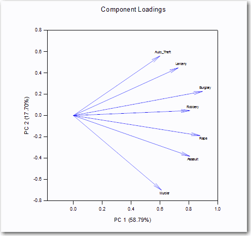 成分負荷量プロット (Component Loadings Plot) は、オリジナルの各変数の近似をユーザーが指定した任意の2つのモデル内主成分による当てはめとしてあらわしたベクトルプロットです。ベクトルはオリジナルの変数の数と同じ数だけ存在します。各ベクトルの大きさは、その変数を説明する標準偏差に対応します。任意の2ベクトル間の角度のコサイン (余弦) は、対応する変数間の相関の近似となります。従って、2つの変数のベクトルが殆ど同一方向か反対方向を指していれば、それらの間には高い相関関係がある (highly correlated) ことになります。もし、2つのベクトルが殆ど直交関係にあるとすれば、それら2つの変数間には相関関係が殆ど無い (highly uncorrelated) ことになります。軸ラベルには、対応する成分によってもたらされる全分散の百分率が表示されます。