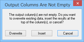 | ※ Note: データを格納する出力列を指定する場合、列の内容を消去して、内容を上書きするか否かを尋ねるダイアログボックスが表示されます。Overwrite をクリックすると、既存の列の内容がトランスフォームの結果に置き換えられます。Insert をクリックすると、既存のセルの内容の上にトランスフォーム結果が配置されます。入力列のデータが計算に掛けられ、指定した出力列に配置されます。 |