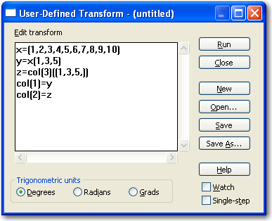 SigmaPlot や SigmaStat で方程式を解く場合、トランスフォーム編集ボックスに入力された式の順序 (sequence) は基本的に問題になりません。ただし、col 関数 (ワークシート列の値を返す関数) では、式の前後関係に意味があります。以下に例を示します。