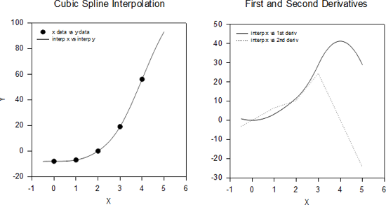 補間式の値は、指定した最小の X 値で始まります。この最小値は、オリジナルの第一データポイントの X 値より、小さいかもしれませんし、等しいかもしれませんし、大きいかもしれません。この補間式は、指定した最大値で終わる等間隔の X 値になります。この最大値は、オリジナルデータの最大の X 値よりも、小さいかもしれませんし、等しいかもしれませんし、大きいかもしれません。