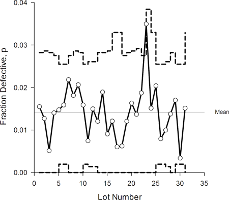 Control Chart グラフを開いていれば、そのグラフページが表示されます。グラフには、プロットスタイルに Line and Scatter with a Simple Straight Line を使って、Y データとして列3がその行番号に対する不良率としてプロットされます。制御ラインは Simple Horizontal Step Plot として列4および列5が各行番号に対してプロットされます。不良率の平均線は、基準線 (reference line) で描画されます。