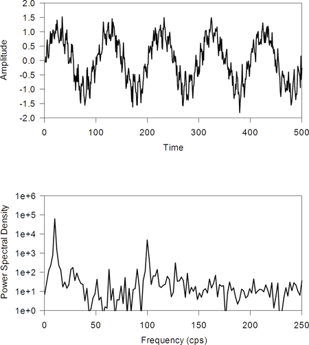 サンプルで用意されたワークシートとグラフを使うには、Transform Examples ノートブックにある Power Spectral Density セクションのグラフページアイコンをダブルクリックして Power Spectral Density のワークシートとグラフを開きます。ワークシートの列1にデータが、グラフページに2つのグラフが表示されます。上のグラフは2つの正弦波の和とガウス型ランダムノイズを加えて生成したデータをあらわします。数式で表すと以下のようになります: