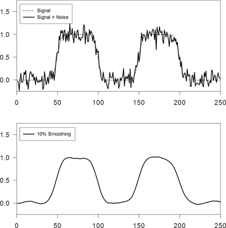 データポイントの y 値は、回帰曲線上の y 値に置き換えられます。回帰曲線の点の数に影響するスムージングの量は、ユーザーによってパラメータ f で指定されます。このパラメータは各回帰分析で使用する点の総数に占める割合です。f = 0.2 を指定したスムーズ曲線に 50個の点があるとすれば、50回の重み付け回帰がそれぞれ10個の点を使って実行されます。