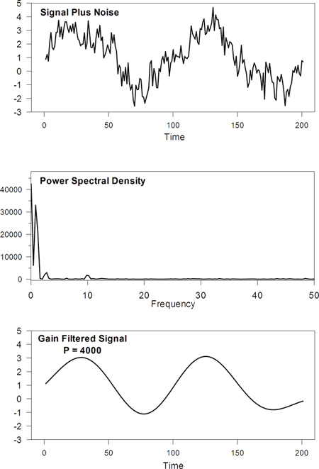 サンプルで用意されたワークシートとグラフを使うには、Transform Examples ノートブックにある Gain Filter Smoothing セクションのグラフページアイコンをダブルクリックして Gain Filter のワークシートとグラフを開きます。ワークシートの列1から列3にデータが、グラフページにプロットをあらわすグラフと空のグラフが表示されます。列1には信号とノイズの Y データが、列2には X データが、列3にはパワースペクトル密度グラフの Y データがそれぞれ格納されています。上のグラフにはシグナルとノイズひずみが、中央のグラフにはパワースペクトル密度がプロットされています。