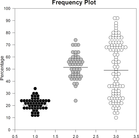 独自のデータを使用するには、列1から列3にデータを配置します。必要に応じてデータを配置する列を増減できますが、サンプルトランスフォームを使用する場合は、トランスフォームファイルの Input 見出しの下の2行目にある Y 値の X 位置を使用するデータ列の数にあわせて変更する必要があります。これとは異なる列に配置している場合や、3列以上のデータを使用する場合は、トランスフォームファイル FREQPLOT.XFM を開いたあとでその列を指定します。別の列に X 軸の目盛りラベルを入力し、Graph Properties Axis タブの Tick Labels パネルにある Tick Labels Type ドロップダウンリストを使用して列から目盛りラベルを指定します。