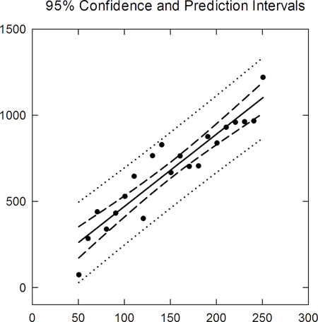 Linear Regression グラフを開いている場合は、グラフページを表示させます。列1と列2のオリジナルデータが散布図としてプロットされます。回帰直線は、X データに列3を、Y データに列4を使って実線でプロットされます。信頼限界は、X many Y として、X に列3を、Y に列7と列8を使って破線でプロットされます。そして、予測限界は X many Y として、X に列3を、Y に列7と列8を使って点線でプロットされます。