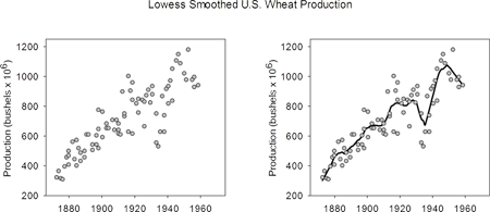 1872年から1958年における合衆国の小麦生産量に関して Lowess スムージングを使った事例を以下の図に示します。スムージングパラメータ f には 0.2 を選択しました。ノイズの多いスムージング不足と、データに含まれる詳細な山と谷を見落としてしまうスムージング過剰の間のちょうど良い妥協点がこの値となるからです。