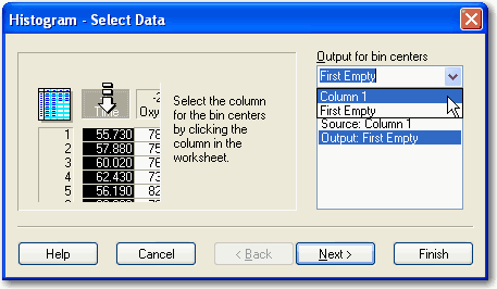 を選択すると、ヒストグラムの頻度データを含むアウトプット列が SigmaPlot のワークシートに表示されます。