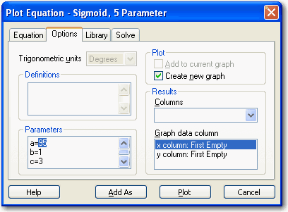 ユーザーの作成した方程式や Standard.jfl の方程式では、いずれもパラメータを編集することができます。ユーザーは、Graph Equation ダイアログボックスの Options タブを使ってパラメーターを入力したり、それらを編集することができます。