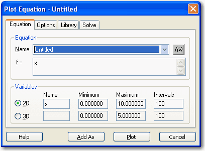 Equation Solver は、Plot Equations ダイアログの Equation タブに入力された式を結果の基準として使用します。Equation タブに式が入力されると、Solve タブに式が表示され、評価されます。