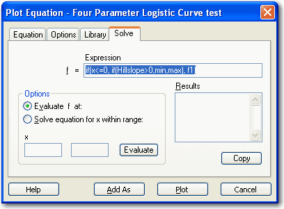 Plot Equations ダイアログボックスの Equation Solver を使えば、関数の数式を評価し、方程式を解くことができます。