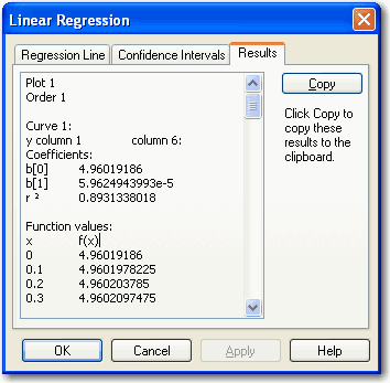 Copy をクリックすると、計算結果がコピーされ、ワークシートやレポート、あるいは、他のウィンドウズアプリケーションに貼り付けることができます。詳しくは、線形回帰、信頼区間、予測区間の計算をご覧ください。