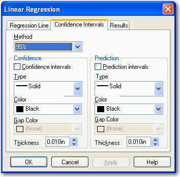 SigmaPlot では、回帰直線の上下に 95% または 99% の信頼区間および予測区間をあらわすラインを描画できます。