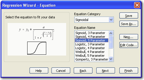 Regression Wizard を使えば、カーブフィッティングの作業が簡単になります。プログラミングや高度な数学的知識を習得する必要はありません。カテゴリ別に整理された膨大な数の方程式ライブラリが画像付きで用意されているので、その中から使用するモデルにふさわしい方程式を選択するだけです。組み込みのショートカット機能を使えば、どのような手順も最低限の操作で実行することができます。例えば、実験データに曲線をあてはめるにも、使用する方程式を選び、ボタンをクリックするだけです。