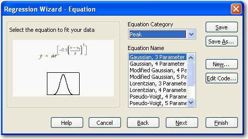 - Equation Category と Equation Name の各ドロップダウンリストをクリックして目的の方程式を選択します。カテゴリと名前を選択することで、様々な方程式があるのを確認することができます。ダイアログの左側には対応する方程式の数式とグラフの形状が表示されます。