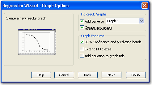 Finish ボタンをクリックすると、すべての結果がワークシート、レポート、あるいはグラフに表示されます。初期設定では、パラメータと計算された従属変数の値がワークシートに保存され、統計レポートが作成され、分析結果がグラフに表示されることになっています。