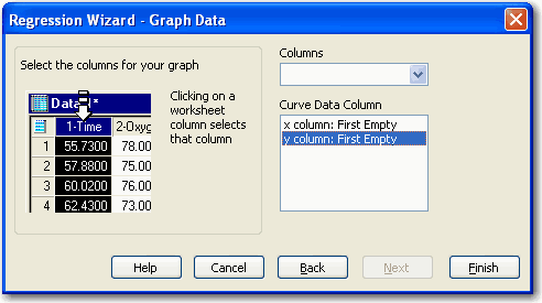 あてはめ曲線のデータの格納で使用する特定の列を選択したい場合は、Next をクリックします。