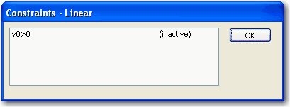 Constraints ダイアログボックスには、すべての制約条件が表示され、その中で条件を満たすものには (active) という文字のフラッグが付きます。なお、パラメータの値が制約条件の境界上にある場合は、制約条件には active というフラッグが付けられます。例えば、パラメータが条件 a+b=1 を満足する場合、制約条件 a+b<1 は、active となりますが、パラメータの条件が a+b<1 の場合は、制約条件は inactive となります。