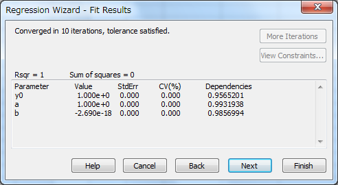 回帰結果が満足のいく内容でない場合は、Back ボタンをクリックして方程式やその他のオプションに変更を加えるか、Cancel ボタンをクリックしてウィザードを閉じることができます。