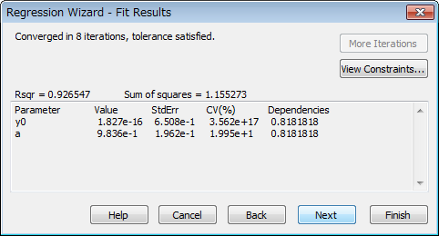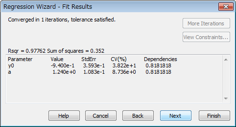 - Next をクリックします。ダイアログボックスが Fit Results になり、フィッティング処理の経過が表示されます。計算が完了したら、最初の回帰分析の結果が表示されます。