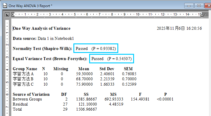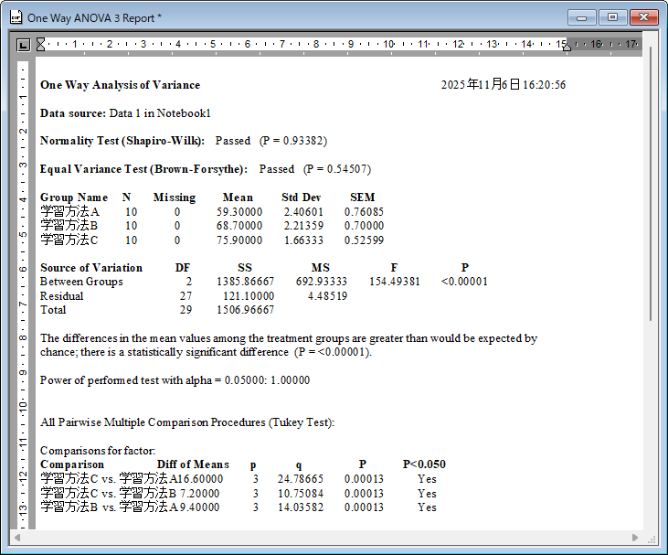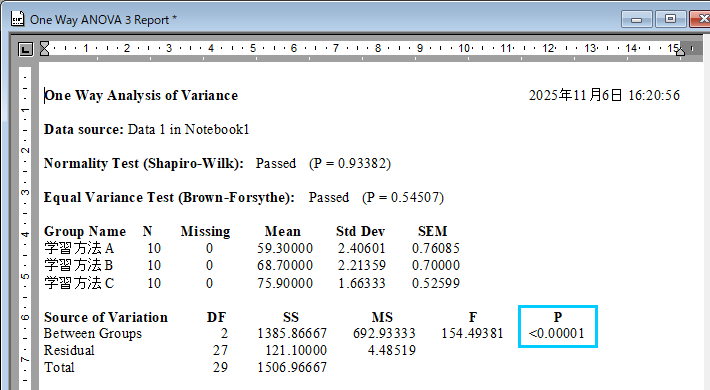Source of Variation の内容は、群間 (Between Groups) の P 値が <0.00001 と α=0.05 より小さい値で帰無仮説は棄却され、対立仮説が採択されます。3つの学習方法には違いがあると言えます。