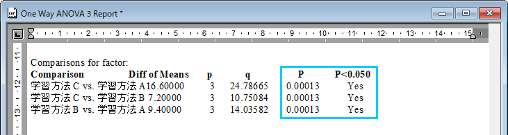 個々の学習法の比較において、すべての比較で P 値が 0.00013 です。α=0.05 より小さい値で帰無仮説が棄却され、対立仮説が採択されます。すべての学習法の組み合わせについて差があると言えます。