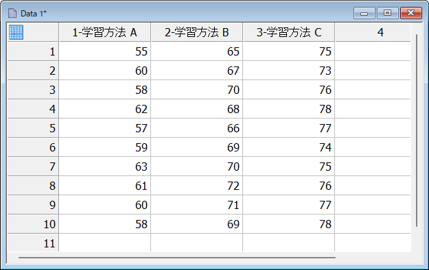 学習法による試験の成績を比較したいと思います。A、B、C の学習法で10名ずつの点数の結果です。この 3つの学習法に、有意な差があるかどうかを One Way ANOVA で検定します。