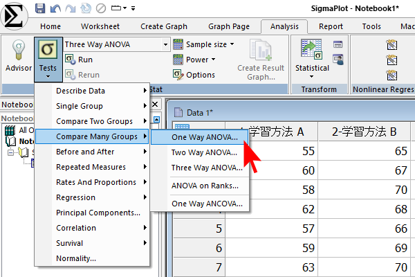 続いて Analysis タブ→ Tests → Compare Many Groups → One Way ANOVA… を実行します。