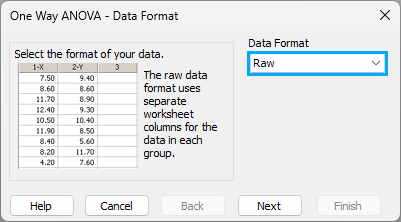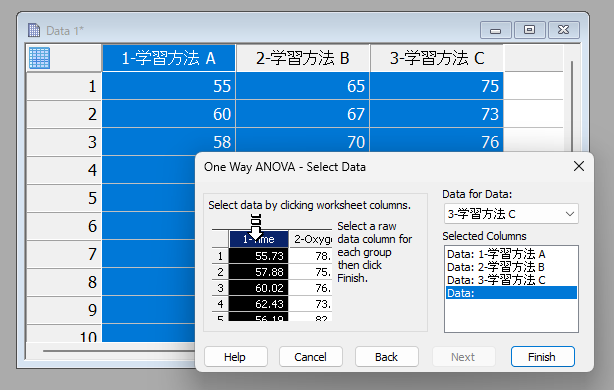 ワークシートから A、B、C の学習方法の変数をマウス操作で選択 (もしくは Data for Data プルダウンメニューから3つの学習方法の変数を選択) して Finish ボタンを押します。
