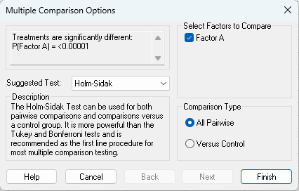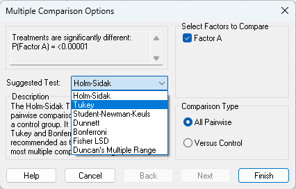 Holm-Sidak 検定が推奨されていますが、ここでは標準的な Tukey を選択して Finish ボタンを押します。
