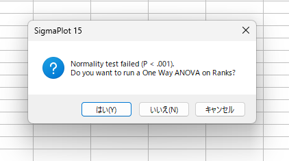 データが正規性もしくは等分散性を満たしていない場合は、SigmaPlot のアドバイザー機能によりノンパラメトリック検定である Kruskal-Wallis One Way Analysis of Variance on Ranks の実施を促されます。