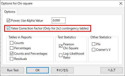 Yates Correction Factor (Only for 2×2 contingency tables) を選択します (デフォルトで選択されています) 。