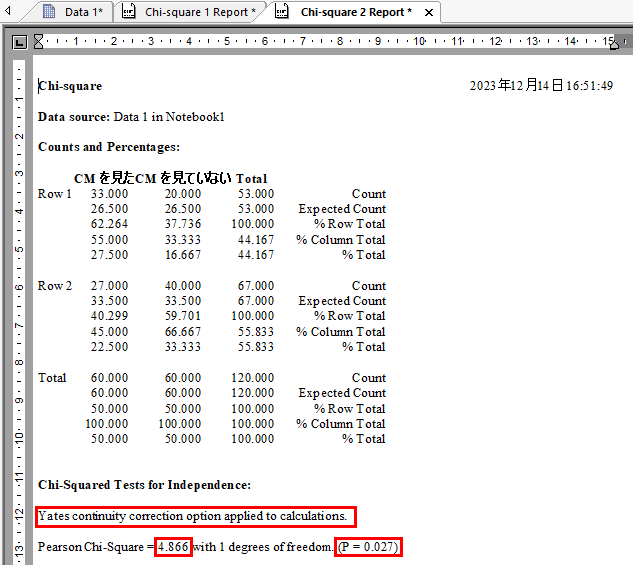 Finish ボタンをクリックすると、カイ二乗検定のレポートが出力されます。