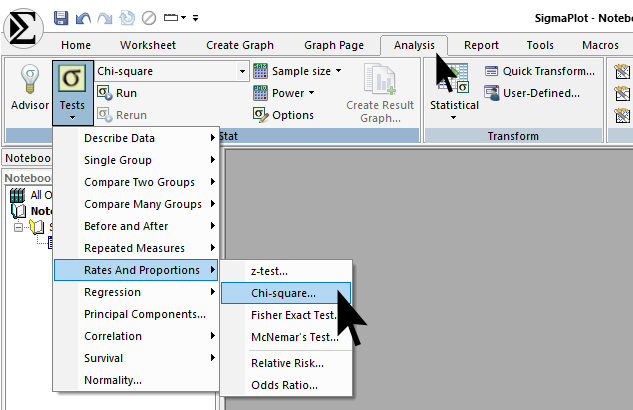続いて Analysis タブ→ Tests → Rates And Proportions → Chi-square… を選択します。