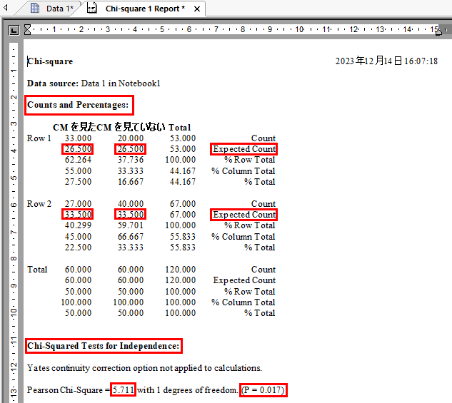 レポートの Counts and Percentages: に Expected Count (期待度数) が表示されます。