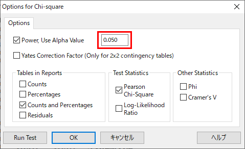 有意水準は Analysis → Options の Power, Use Alpha Value のオプションで指定できます。 有意水準のデフォルトは 0.05 です。